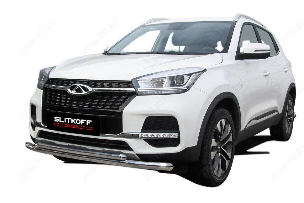 Защита переднего бампера d57+d42 двойная Chery Tiggo 4 (2018-2023) Black Edition, Slitkoff, арт. CT4-001BE