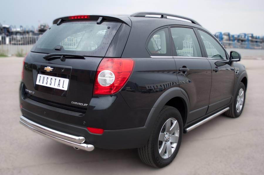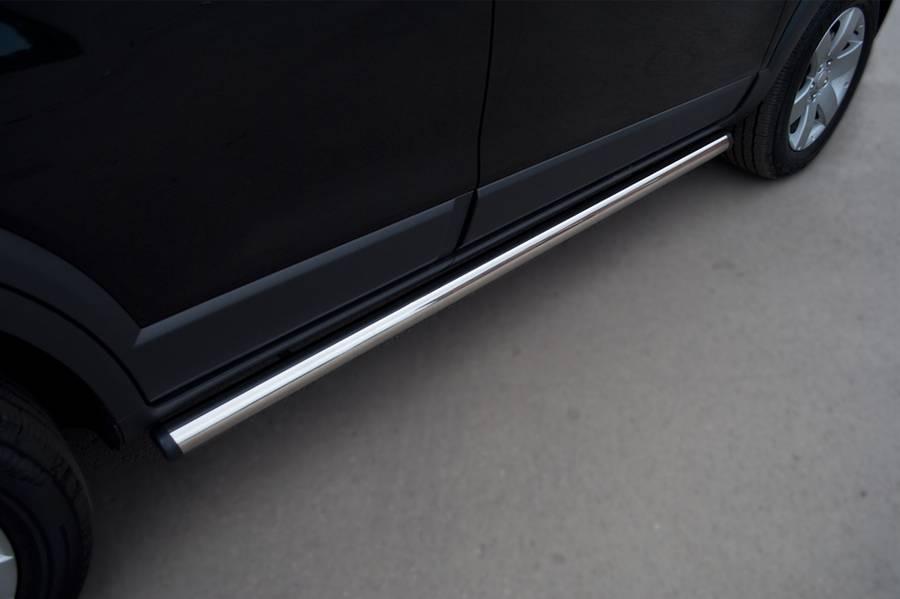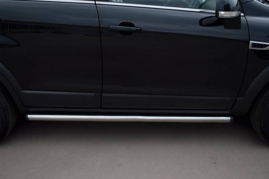 Пороги для Chevrolet Captiva 2012 изготовлены из высококачественной нержавеющей стали марки AISI 304, труба имеет диаметр 57 мм. Торцы труб закрыты пластиковыми заглушками.