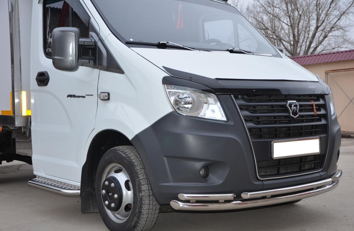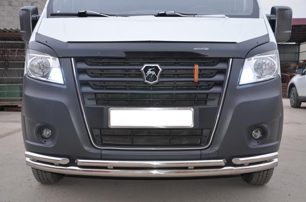 Защита переднего бампера для автомобиля ГАЗ ГАЗель Next 2014. GZNXT.14.03 представляет собой элемент тюнинга и защиты автомобиля и производится специально для данной модели. Данное изделие изготавливается из нержавеющей стали и полируется вручную, что обеспечивает сохранение отличного внешнего вида в течение длительного времени в наших непростых климатических условиях. Срок поставки продукции производства компании ЮКК Россия составляет 1-5 дней. Установить деталь Защита переднего бампера для автомобиля ГАЗ ГАЗель Next 2014. GZNXT.14.03 можно на нашем сервисе, предварительно записавшись по телефону.