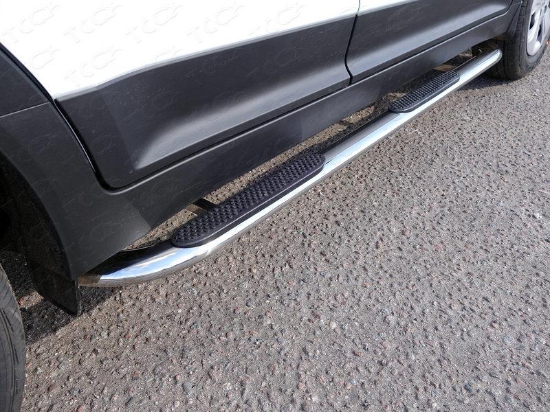Пороги овальные гнутые с накладкой 75х42 мм для автомобиля Hyundai Creta 2016- представляет собой элемент тюнинга и защиты автомобиля и производится специально для данной модели. Данное изделие изготавливается из нержавеющей стали и полируется вручную, что обеспечивает сохранение отличного внешнего вида в течение длительного времени в наших непростых климатических условиях. Срок поставки продукции производства компании TCC Тюнинг составляет 1-5 дней. Установить Пороги овальные гнутые с накладкой 75х42 мм для автомобиля Hyundai Creta 2016- можно на нашем сервисе, предварительно записавшись по телефону.