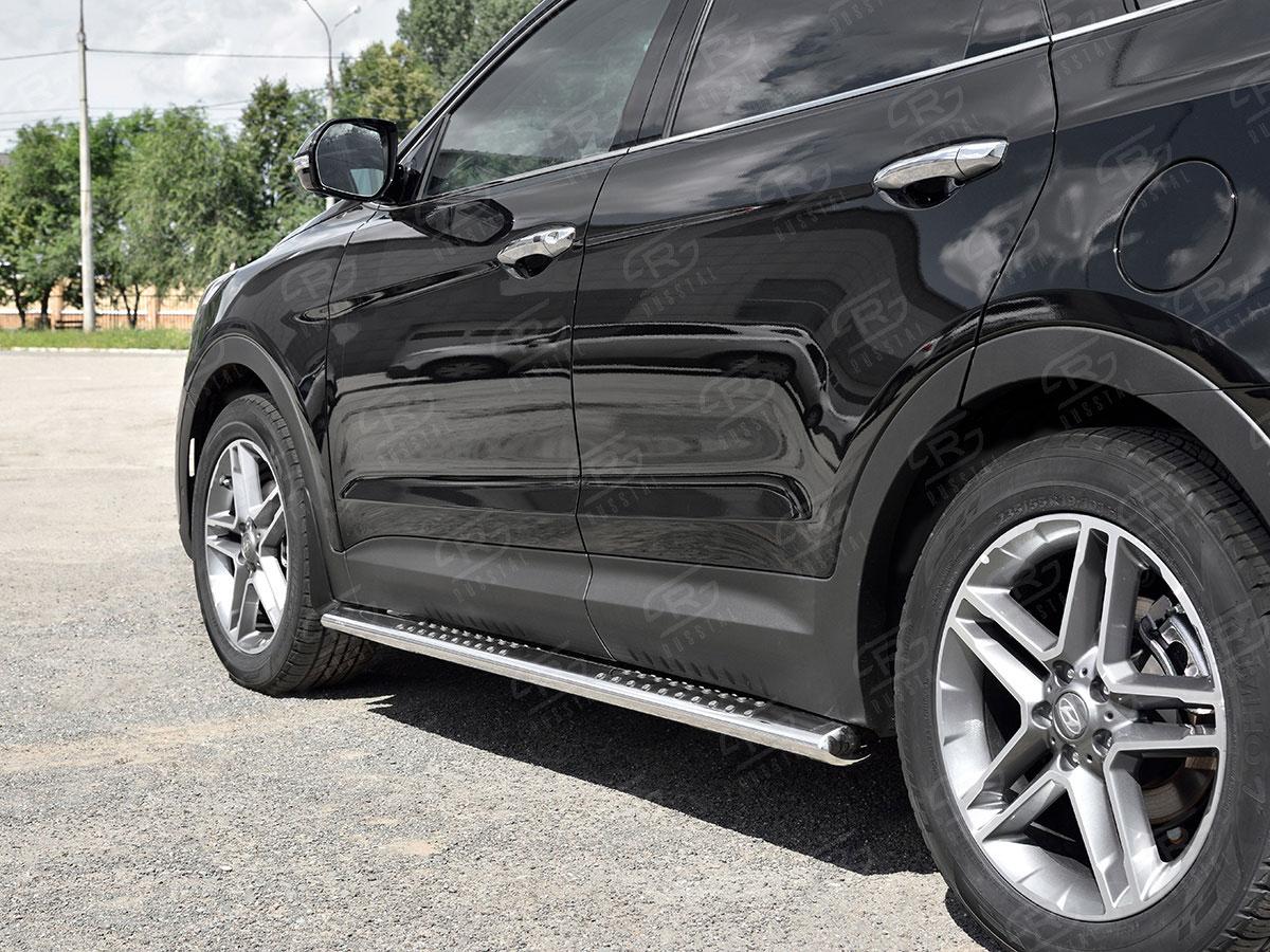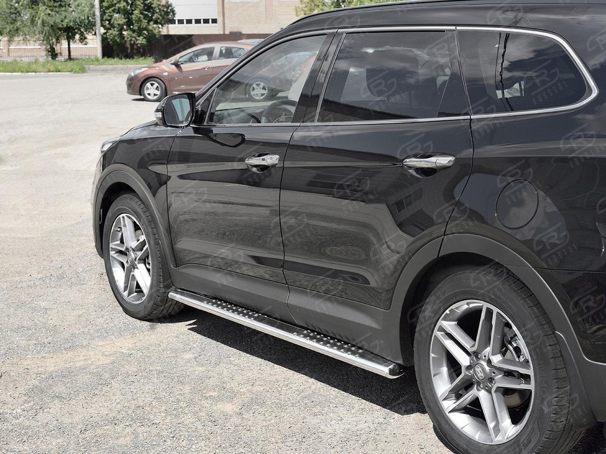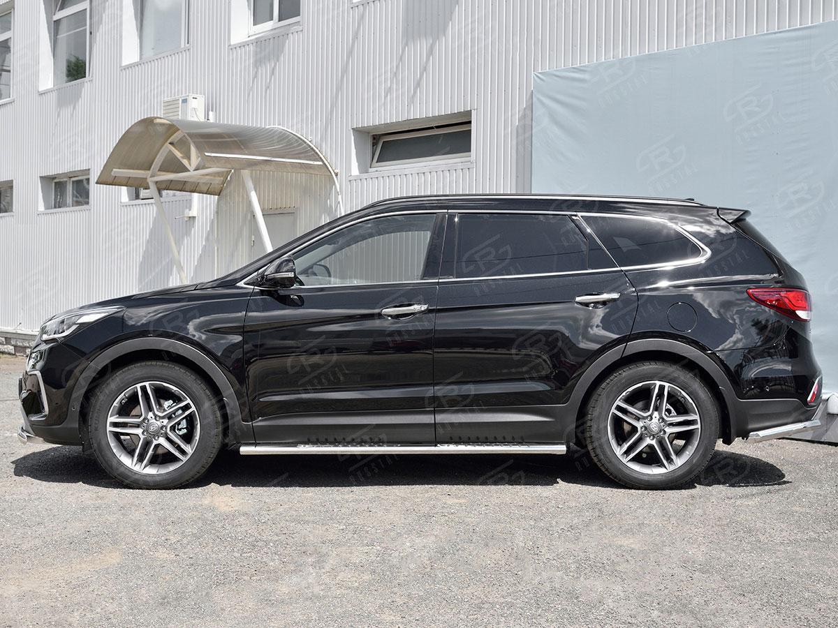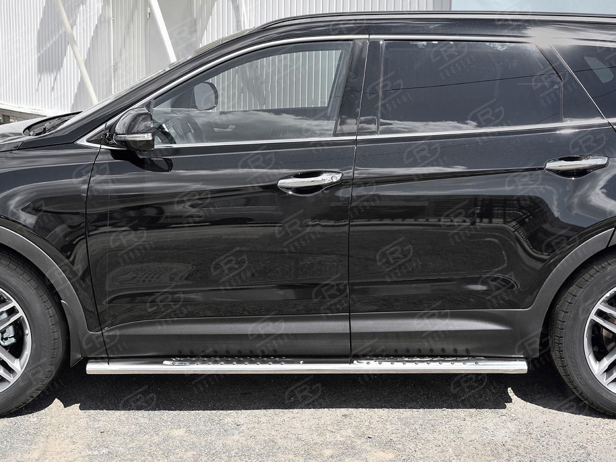 Пороги с проступью Русcталь для Hyundai Santa Fe Grand 2016 (Хендэ Санта Фе Гранд 2016) HSFO-002735 изготовлены из высококачественной нержавеющей стали марки AISI 304, труба имеет диаметр 120x60 мм.