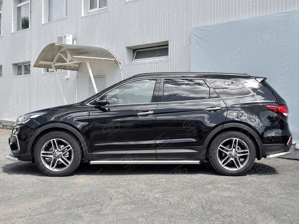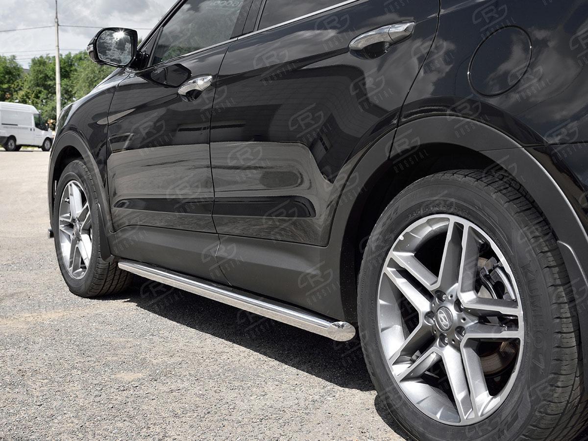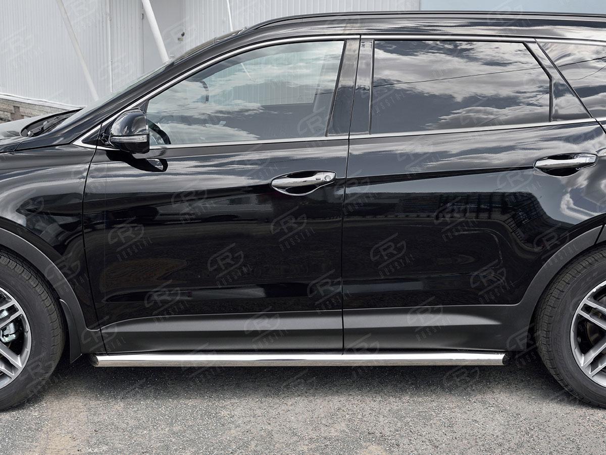 Пороги трубы Русcталь для Hyundai Santa Fe Grand 2016 (Хендэ Санта Фе Гранд 2016) HSFT-0027381 изготовлены из высококачественной нержавеющей стали марки AISI 304, труба имеет диаметр 57 мм.