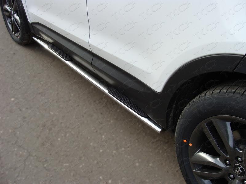 Пороги овальные с накладкой 75х42 мм для автомобиля Hyundai Santa Fe (DM) 2012-2018 представляет собой элемент тюнинга и защиты автомобиля и производится специально для данной модели. Данное изделие изготавливается из нержавеющей стали и полируется вручную, что обеспечивает сохранение отличного внешнего вида в течение длительного времени в наших непростых климатических условиях. Срок поставки продукции производства компании TCC Тюнинг составляет 1-5 дней. Установить Пороги овальные с накладкой 75х42 мм для автомобиля Hyundai Santa Fe (DM) 2012-2018 можно на нашем сервисе, предварительно записавшись по телефону.