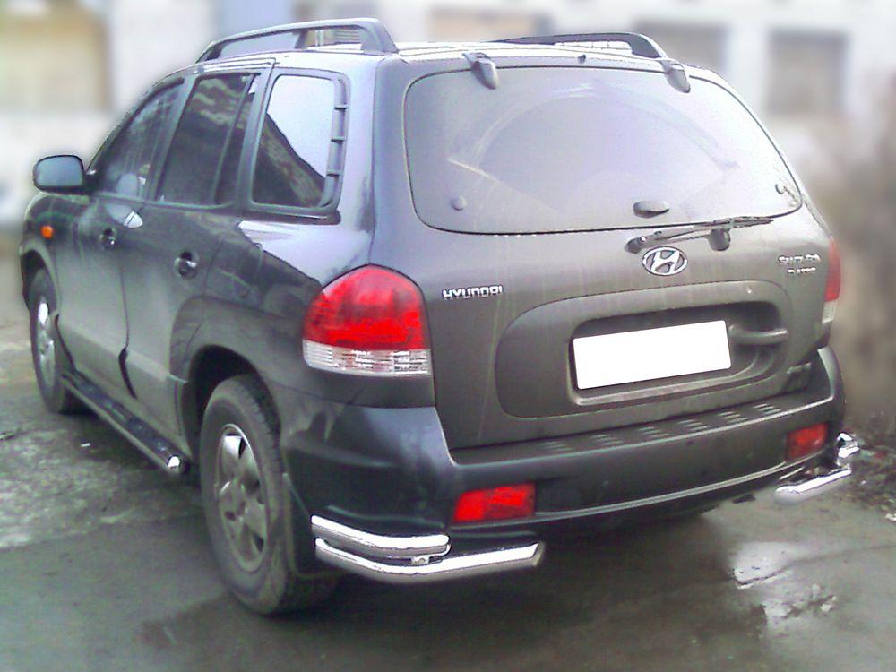 Защита заднего бампера уголкиd60+43 для Hyundai Santa Fe 2000-2006, Технотек HS_5 изготовлена из высококачественной нержавеющей стали, труба имеет диаметр 60/43 мм. В комплекте поставляется набор крепежа и инструкция по установке.
