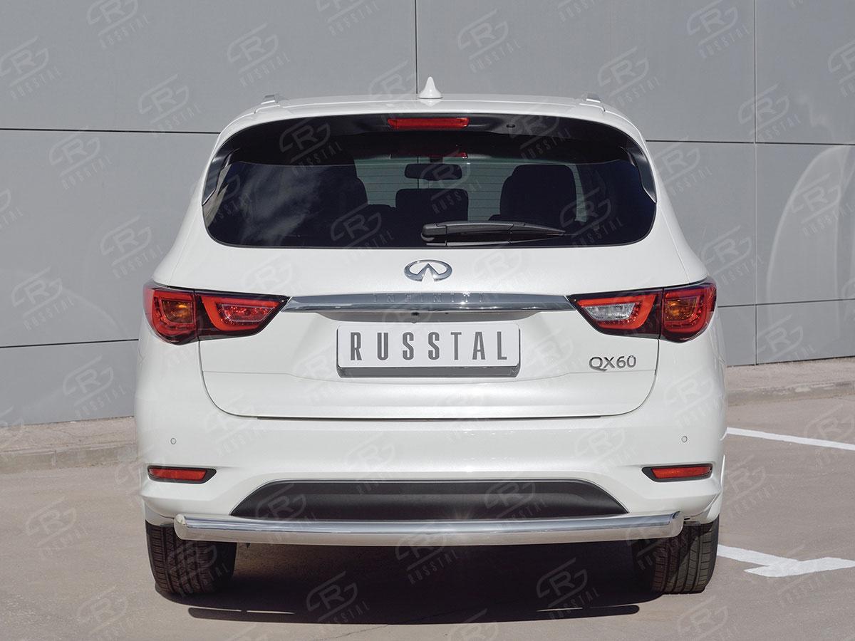 Защита заднего бампера Русcталь для Infiniti QX60 2016 (Инфинити QX 2016) IQXZ-002688 изготовлена из высококачественной нержавеющей стали марки AISI 304, труба имеет диаметр 76 мм.