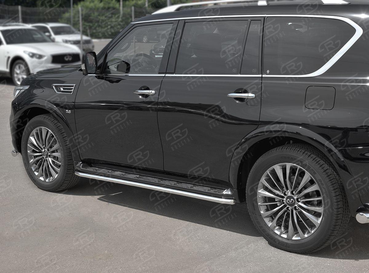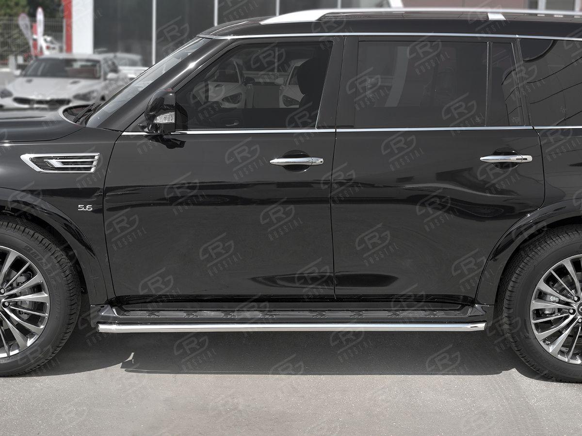 Защита штатных порогов Русcталь для Infiniti QX80 2018 (Инфинити КуИкс80 2018) IQX8T-003012 изготовлена из высококачественной нержавеющей стали марки AISI 304, она также называется пищевая нержавейка. Труба имеет диаметр 42 мм.