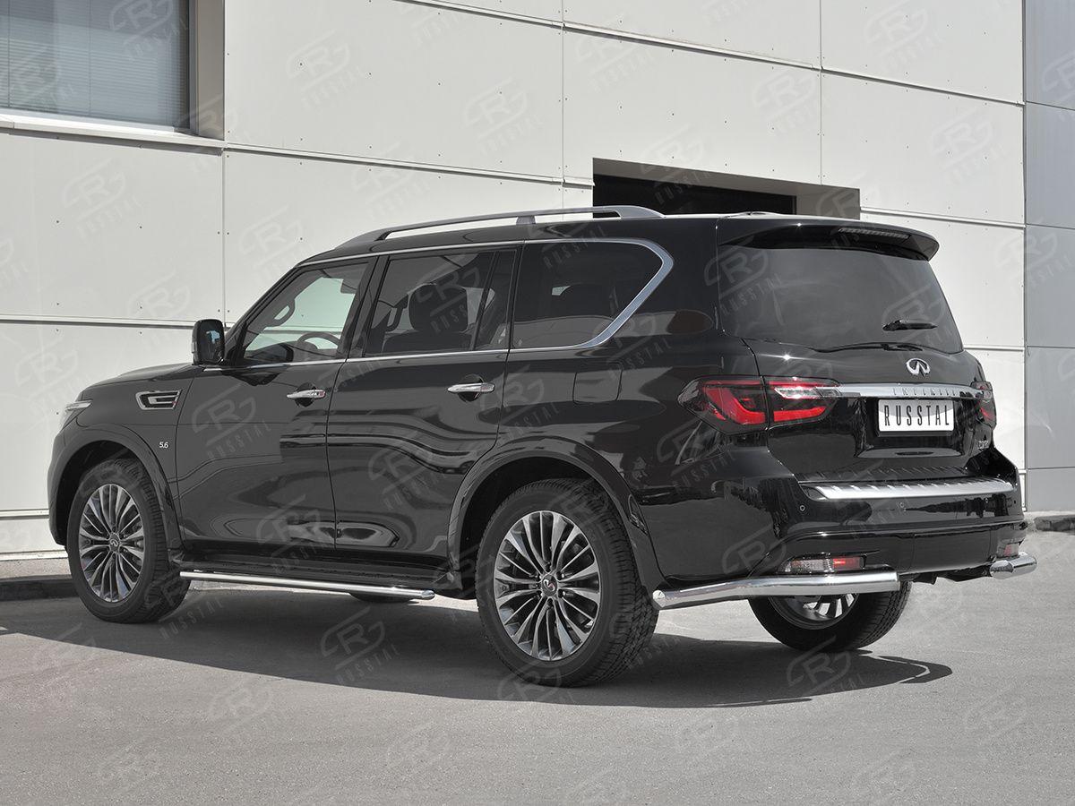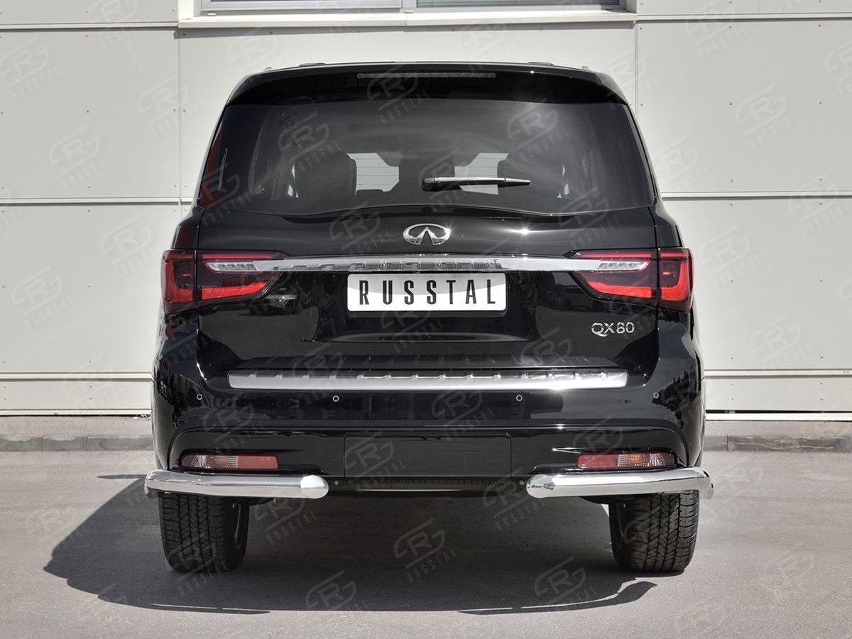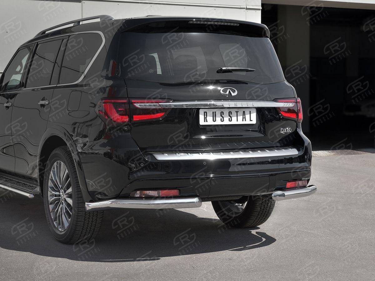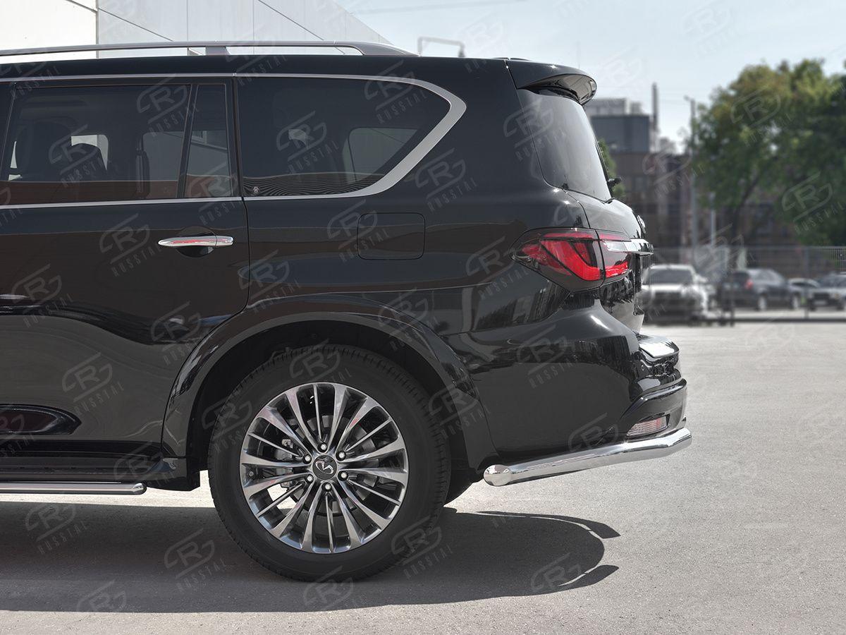 Защита заднего бампера Русcталь для Infiniti QX80 2018 (Инфинити КуИкс80 2018) IQX8Z-003017 изготовлена из высококачественной нержавеющей стали марки AISI 304, она также называется пищевая нержавейка. Труба имеет диаметр 76 мм.