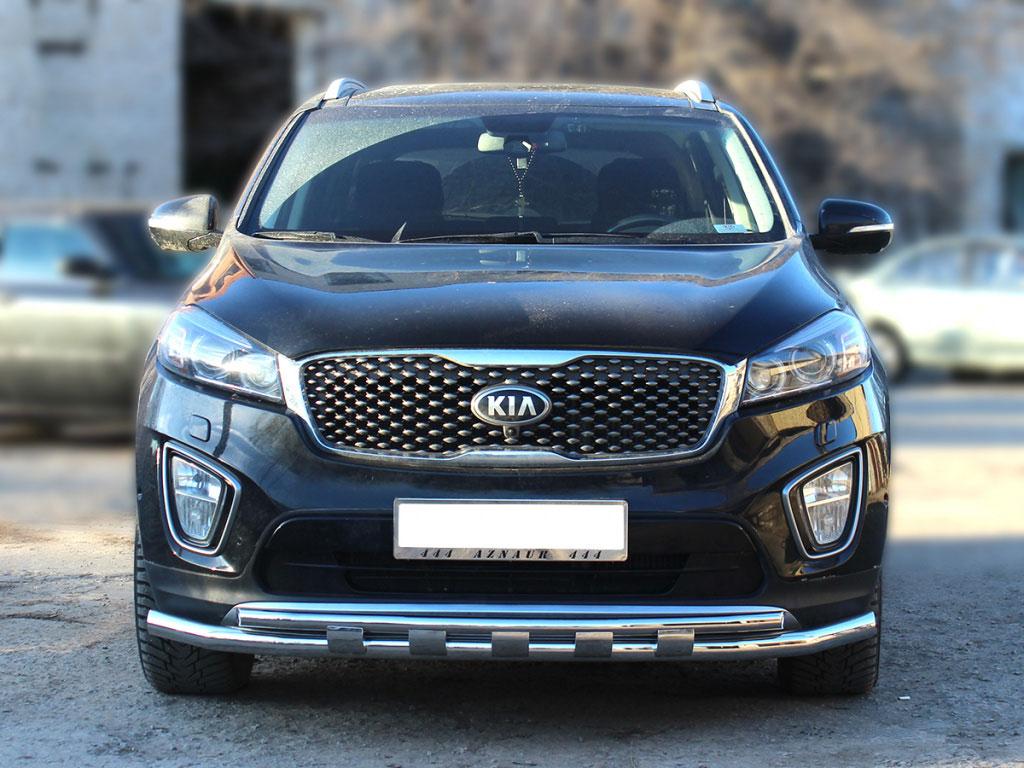 Дуга передняя по низу бампера радиусная двойная с накладками на KIA Sorento Prime 2015 (Киа Соренто Прайм 2015) изготовлена компанией Технотек из высококачественной нержавеющей стали, труба имеет диаметр 60/43 мм. В комплекте поставляется набор крепежа и инструкция по установке.