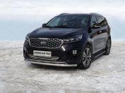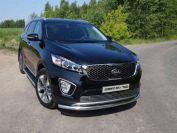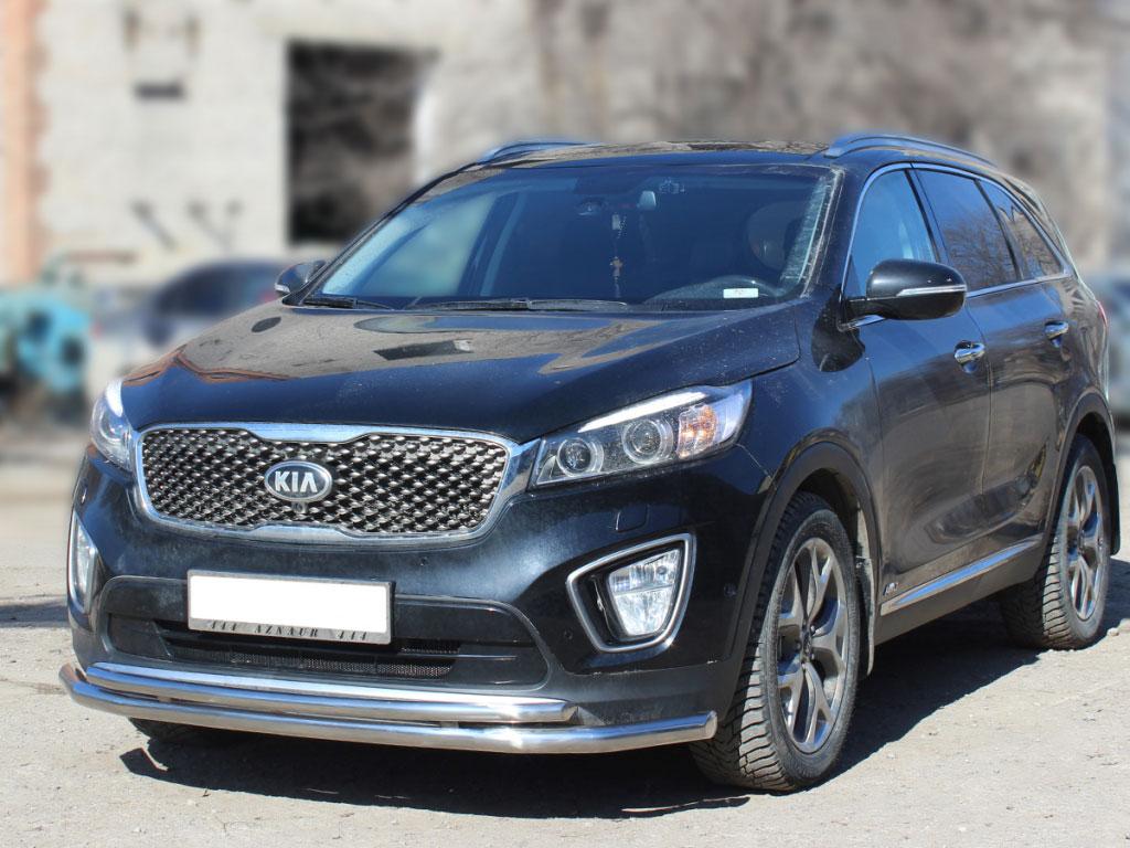 Дуга передняя по низу бампера радиусная двойная на KIA Sorento Prime 2015 (Киа Соренто Прайм 2015) изготовлена компанией Технотек из высококачественной нержавеющей стали, труба имеет диаметр 60/43 мм. В комплекте поставляется набор крепежа и инструкция по установке.