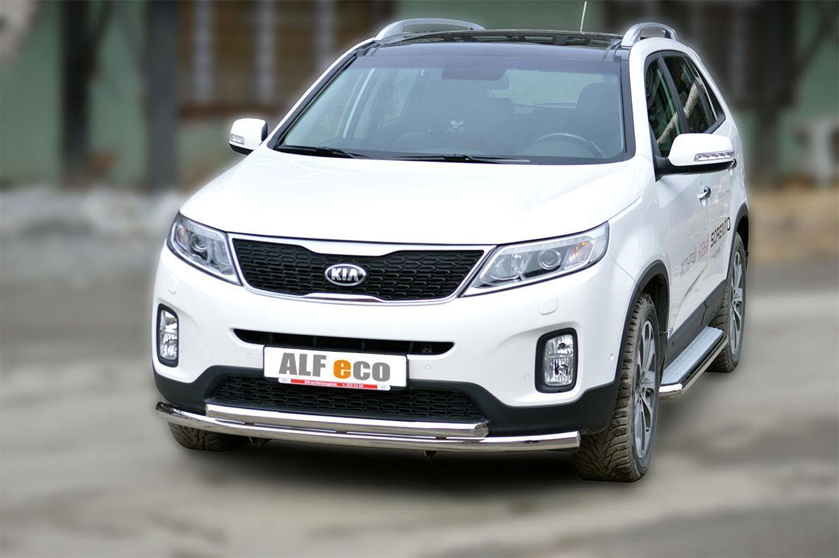 Защита передняя двойная KIASOR-12.03 для Kia Sorento (Киа Соренто) изготовлена из нержавеющей стали AISI 304 (аналог 08Х18Н10). Труба имеет диаметр 60,3/50,8 мм. Детали для тюнинга из нержавейки не боятся коррозии, они прочны и долговечны. Все элементы обвеса на предприятии ALFeco в Нижнем Тагиле, проходят строгий контроль качества. br> Защита переднего бампера защитит бампер от нежелательных повреждений: царапин и потертостей, которые могут появиться во дворах и на тесных парковках. Для установки данного изделия на Киа Соренто сверления кузова не потребуется, достаточно штатных точек крепления. Записаться на установку можно по телефону. Срок поставки 1-7 дней в зависимости от наличия на складе, уточнить можно связавшись с нами удобным для вас способом.