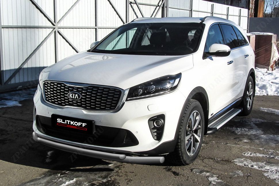 Защита переднего бампера d57+d42 двойная серебристая Kia Sorento Prime (2017-2020) , Slitkoff, арт. KS17-001S