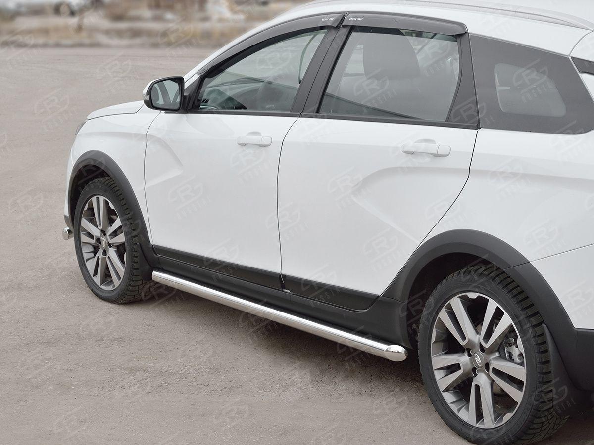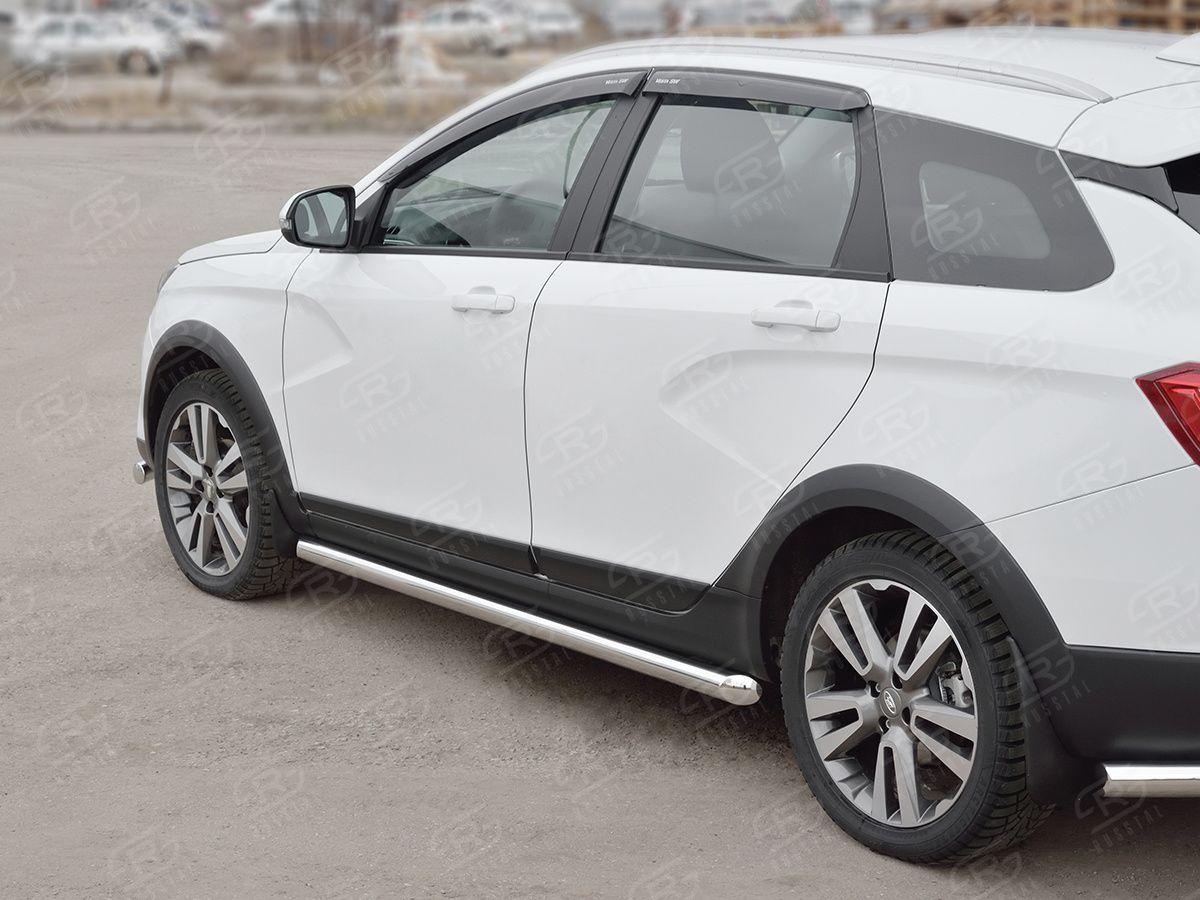 Пороги Русcталь для Лада Веста Кросс 2017 (Lada Vesta Cross) LVT-0028491 изготовлены из высококачественной нержавеющей стали марки AISI 304, труба имеет диаметр 57 мм.
