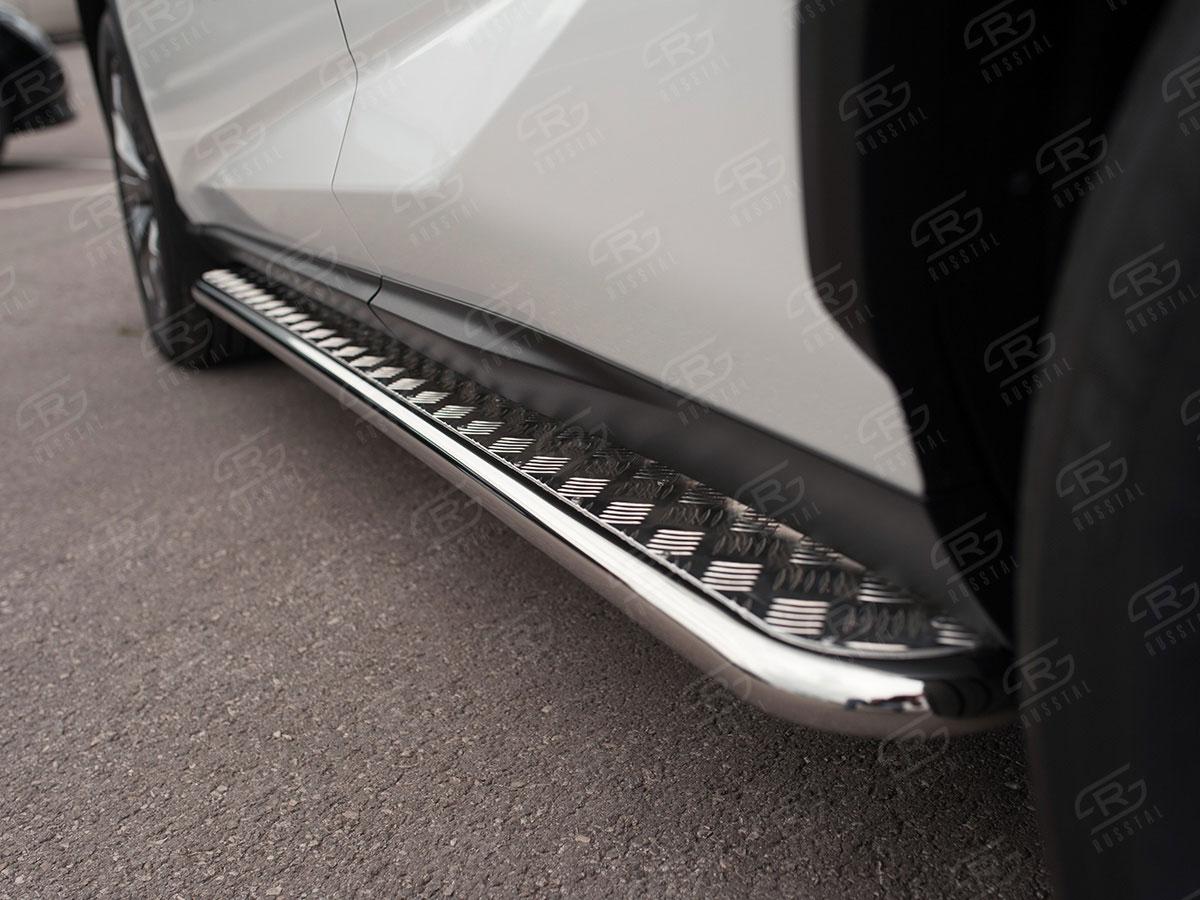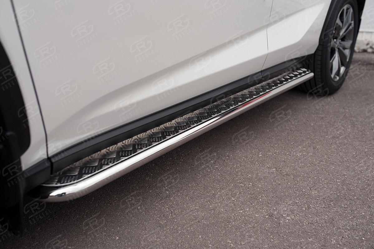 Пороги с листом Русcталь для Lexus NX 2014 (Лексус NX 2014) кроме F-Sport! LNXL-0025811 изготовлены из высококачественной нержавеющей стали марки AISI 304, труба имеет диаметр 42 мм.