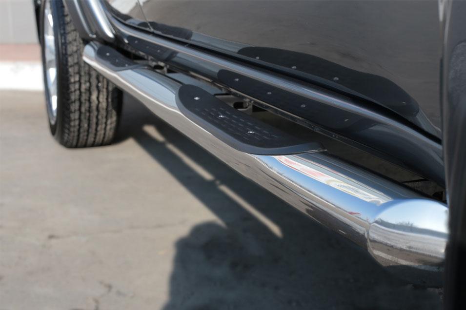 Пороги Slitkoff для Mitsubishi L200 2014 (Митсубиши Л200 2014) MLT-0020391 изготовлены из высококачественной нержавеющей стали марки AISI 304, труба имеет диаметр 76 мм. Торцы труб скошены под 45 градусов.