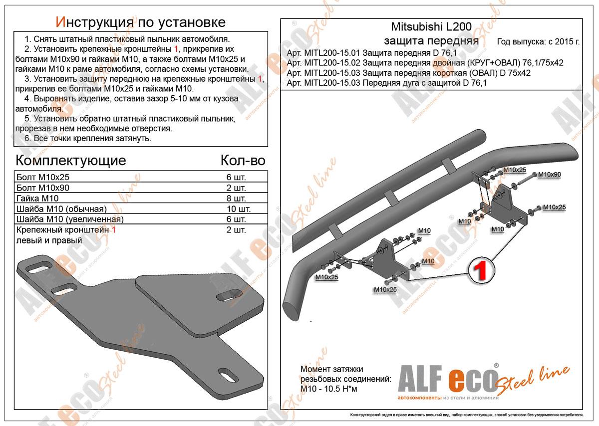 Защита передняя MITL200-15.01 для Mitsubishi L200 (Мицубиси Л200) изготовлена из нержавеющей стали AISI 304 (аналог 08Х18Н10). Труба имеет диаметр 76,1 мм. Детали для тюнинга из нержавейки не боятся коррозии, они прочны и долговечны. Все элементы обвеса на предприятии ALFeco в Нижнем Тагиле, проходят строгий контроль качества. br> Защита переднего бампера защитит бампер от нежелательных повреждений: царапин и потертостей, которые могут появиться во дворах и на тесных парковках. Для установки данного изделия на Мицубиси Л200 сверления кузова не потребуется, достаточно штатных точек крепления. Записаться на установку можно по телефону. Срок поставки 1-7 дней в зависимости от наличия на складе, уточнить можно связавшись с нами удобным для вас способом.