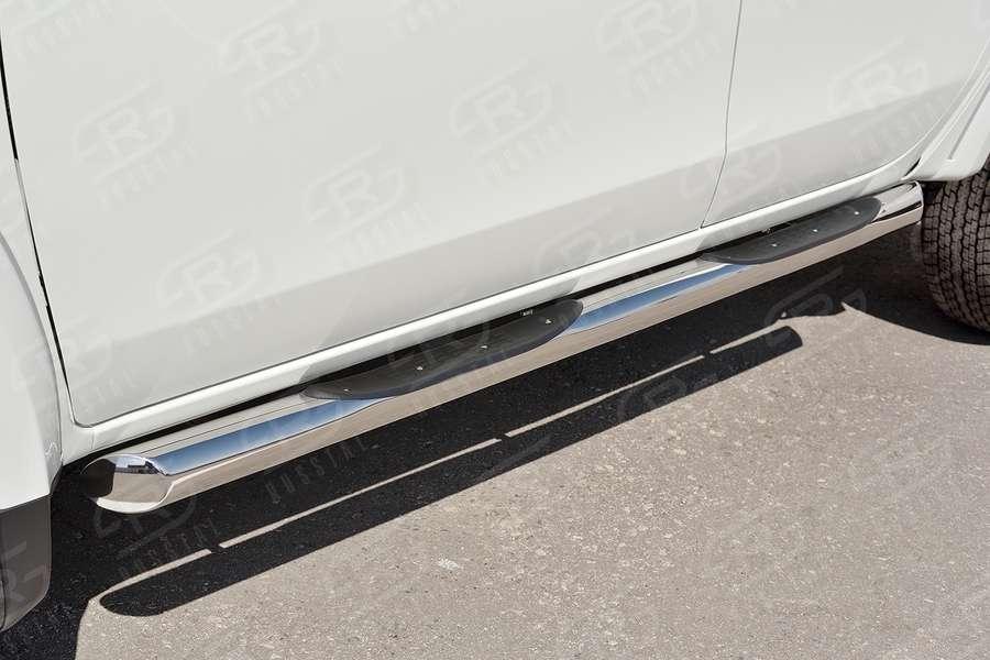 Пороги Slitkoff для Mitsubishi L200 2015 (Митсубиши Л200 2015) ML2T-0022491 изготовлены из высококачественной нержавеющей стали марки AISI 304, труба имеет диаметр 76 мм.