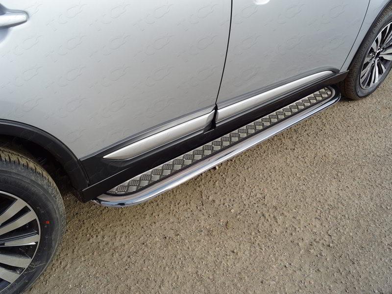 Пороги с площадкой 75х42 мм для автомобиля Mitsubishi Outlander 2018- представляет собой элемент тюнинга и защиты автомобиля и производится специально для данной модели. Данное изделие изготавливается из нержавеющей стали и полируется вручную, что обеспечивает сохранение отличного внешнего вида в течение длительного времени в наших непростых климатических условиях. Срок поставки продукции производства компании TCC Тюнинг составляет 1-5 дней. Установить Пороги с площадкой 75х42 мм для автомобиля Mitsubishi Outlander 2018- можно на нашем сервисе, предварительно записавшись по телефону.