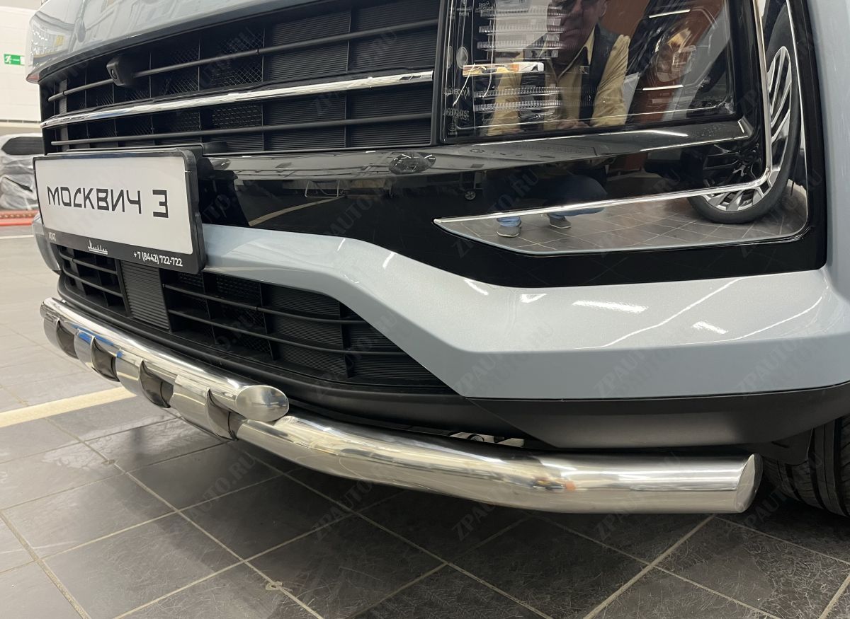 Защита переднего бампера d 60/42 арт. MSK3.22.75 для автомобиля Москвич 3 2022 - представляет собой элемент тюнинга и защиты автомобиля и производится специально для данной модели. Данное изделие изготавливается из нержавеющей стали и полируется вручную, что обеспечивает сохранение отличного внешнего вида в течение длительного времени в наших непростых климатических условиях. Срок поставки составляет 1-5 дней. Установить деталь Защита переднего бампера d 60/42 арт. MSK3.22.75 для автомобиля Москвич 3 2022 можно на нашем сервисе, предварительно записавшись по телефону.
