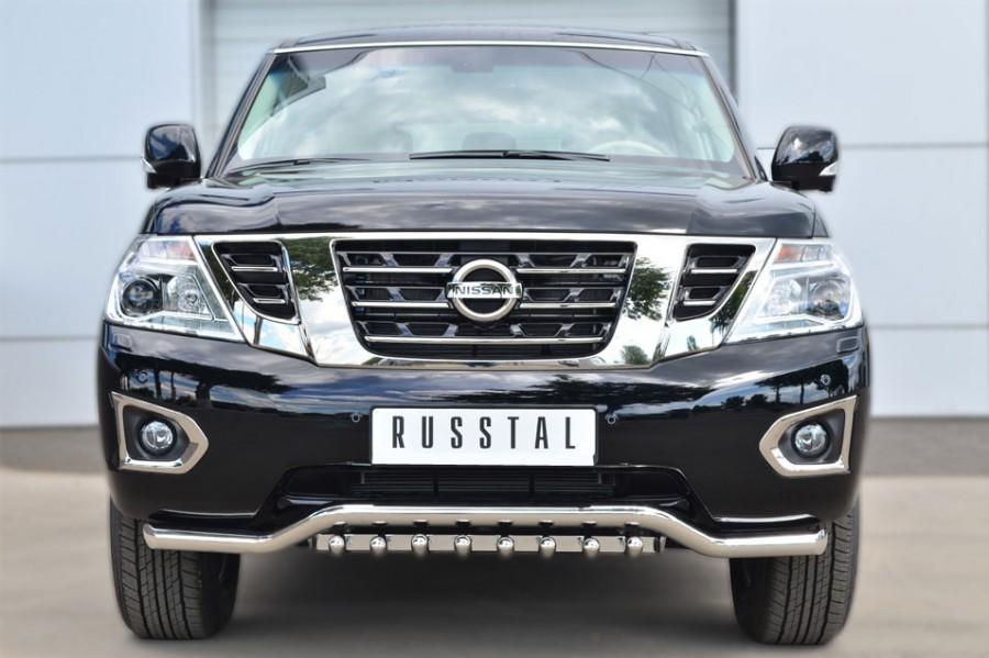 Защита переднего бампера Slitkoff для Nissan Patrol 2014 PATZ-001731 изготовлена из высококачественной нержавеющей стали марки AISI 304, труба имеет диаметр 57/42 мм.