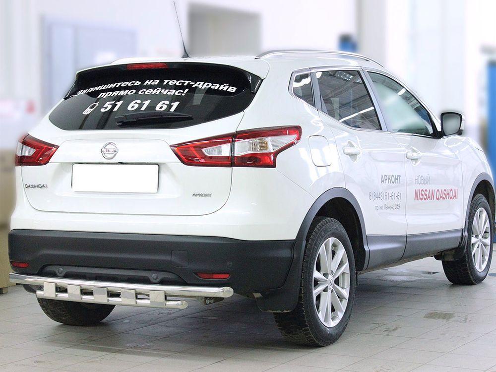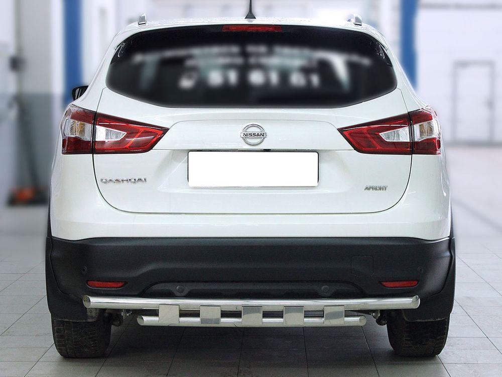 Защита заднего бампера двойная радиусная d53+43 с доп. накладками для Nissan Qashqai 2014, Технотек NQ_3.2 изготовлена из высококачественной нержавеющей стали, труба имеет диаметр 53/43 мм. В комплекте поставляется набор крепежа и инструкция по установке.