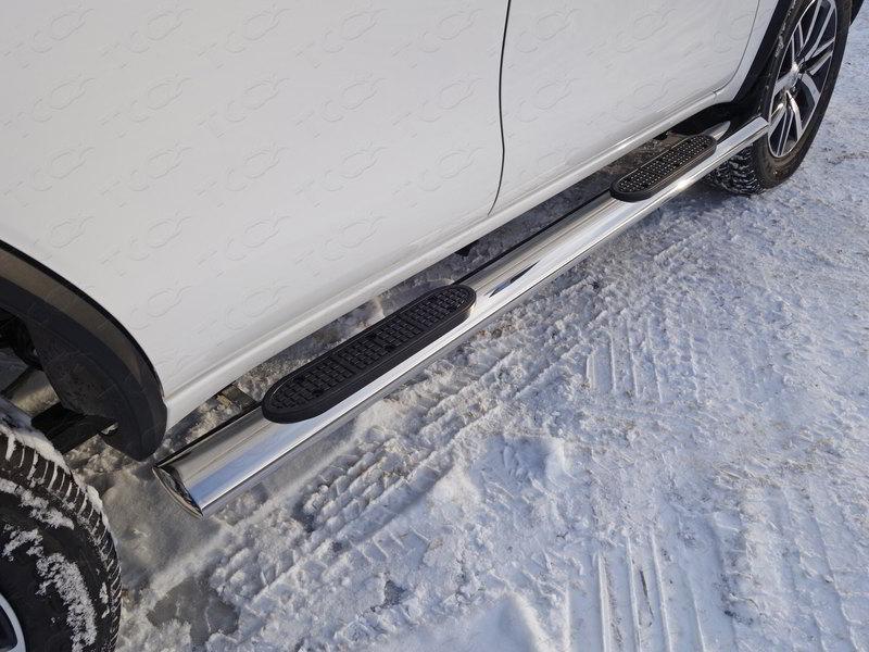 Пороги овальные с накладкой 120х60 мм для автомобиля Toyota Fortuner 2017- представляет собой элемент тюнинга и защиты автомобиля и производится специально для данной модели. Данное изделие изготавливается из нержавеющей стали и полируется вручную, что обеспечивает сохранение отличного внешнего вида в течение длительного времени в наших непростых климатических условиях. Срок поставки продукции производства компании TCC Тюнинг составляет 1-5 дней. Установить Пороги овальные с накладкой 120х60 мм для автомобиля Toyota Fortuner 2017- можно на нашем сервисе, предварительно записавшись по телефону.