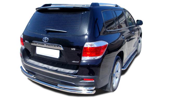 Защита заднего бампера двойная+ короткая для автомобиля TOYOTA Highlander 2010. THL.10.26 представляет собой элемент тюнинга и защиты автомобиля и производится специально для данной модели. Данное изделие изготавливается из нержавеющей стали и полируется вручную, что обеспечивает сохранение отличного внешнего вида в течение длительного времени в наших непростых климатических условиях. Срок поставки продукции производства компании ЮКК Россия составляет 1-5 дней. Установить деталь Защита заднего бампера двойная+ короткая для автомобиля TOYOTA Highlander 2010. THL.10.26 можно на нашем сервисе, предварительно записавшись по телефону.