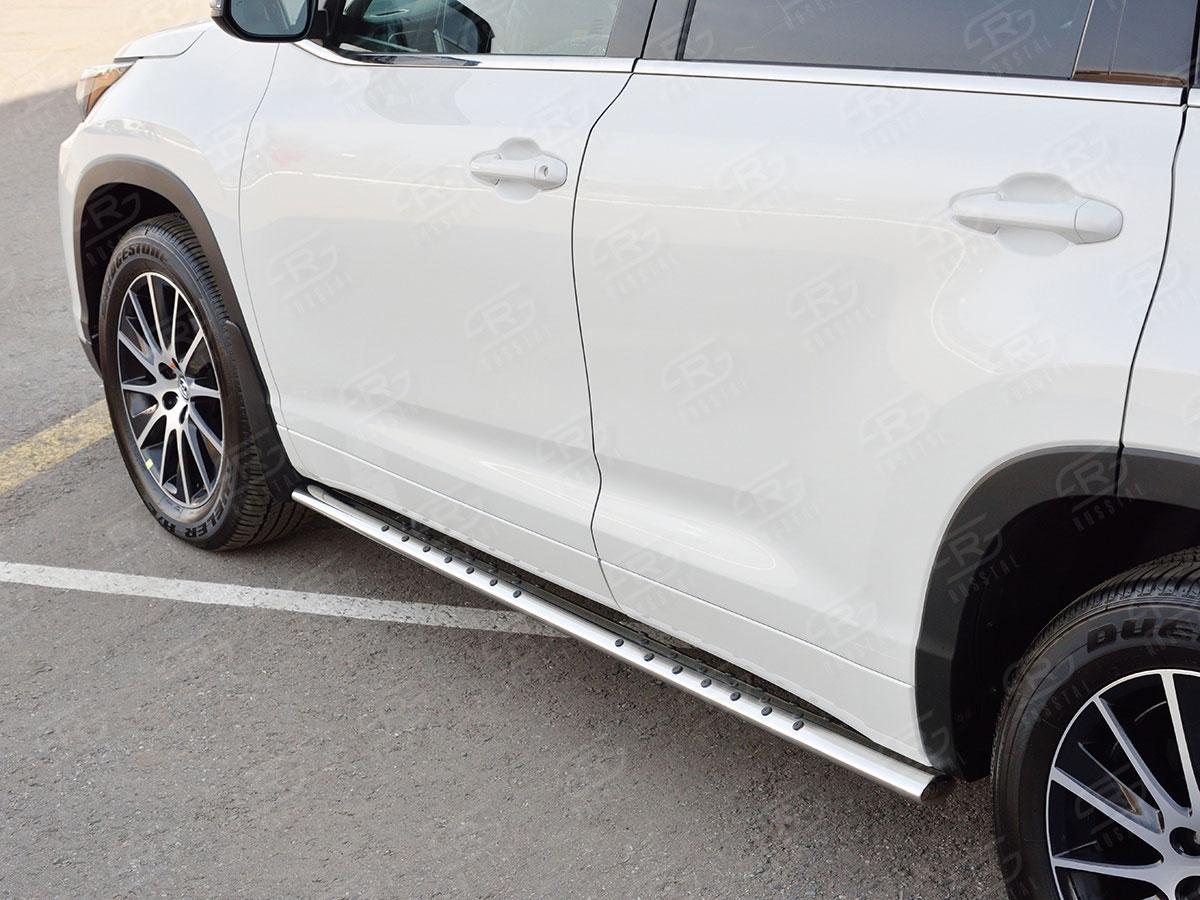 Пороги овальные с проступью Русcталь для Toyota Highlander 2016 (Тойота Хайлендер 2016) THRO-002620 изготовлены из высококачественной нержавеющей стали марки AISI 304, она также называется пищевая нержавейка. Труба имеет диаметр 75x42 мм.