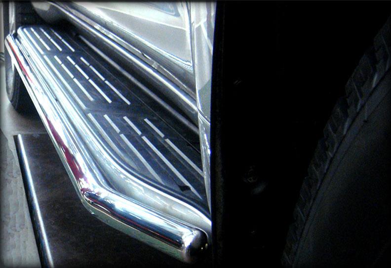 Пороги, обвод штатного порога в торец на Toyota Land Cruiser Prado 150 2017 (Тойота Ленд Крузер Прадо 150 2017) изготовлены компанией Технотек из высококачественной нержавеющей стали, труба имеет диаметр 43 мм. В комплекте поставляется набор крепежа и инструкция по установке.