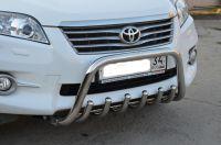 Защита переднего бампера радиусная двойная d53+43 с двумя загибами для Toyota RAV4 2012, Технотек TRN13_1.3 изготовлена из высококачественной нержавеющей стали, труба имеет диаметр 53/43 мм. В комплекте поставляется набор крепежа и инструкция по установке.