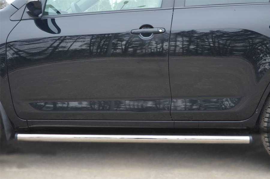 Пороги для Toyota RAV 4 (обычная база) 2010- изготовлены из высококачественной нержавеющей стали марки AISI 304, труба имеет диаметр 57 мм. Торцы труб закрыты пластиковыми заглушками.