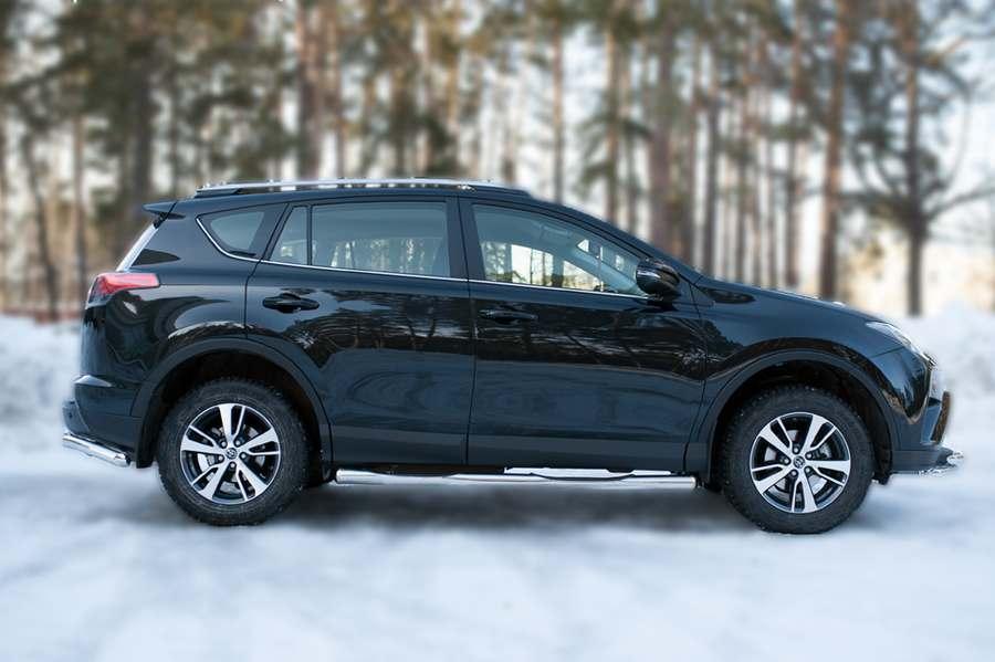 Пороги Slitkoff для Toyota RAV4 2015 (Тойота РАВ4 2015) TR4T-0021957 изготовлены из высококачественной нержавеющей стали марки AISI 304, труба имеет диаметр 76 мм.