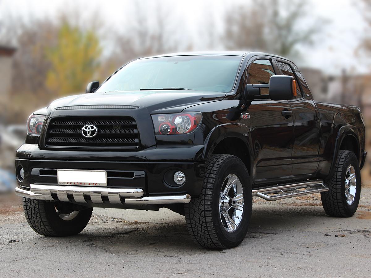 Защита переднего бампера d-76 с доп.накладками, арт. TTU_1.3 для автомобиля Toyota Tundra 2007-2013г.в. - представляет собой элемент тюнинга и защиты автомобиля и производится специально для данной модели компанией Технотек. Данное изделие изготавливается из высококачественной нержавеющей стали AISI 304 с полировкой, что обеспечивает сохранение отличного внешнего вида в течение длительного времени в наших непростых климатических условиях. Срок поставки составляет 1-5 дней. Установить деталь Защита переднего бампера d-76 с доп.накладками для автомобиля Toyota Tundra 2007-2013г.в. можно на нашем сервисе, предварительно записавшись по телефону.