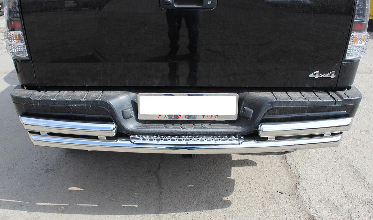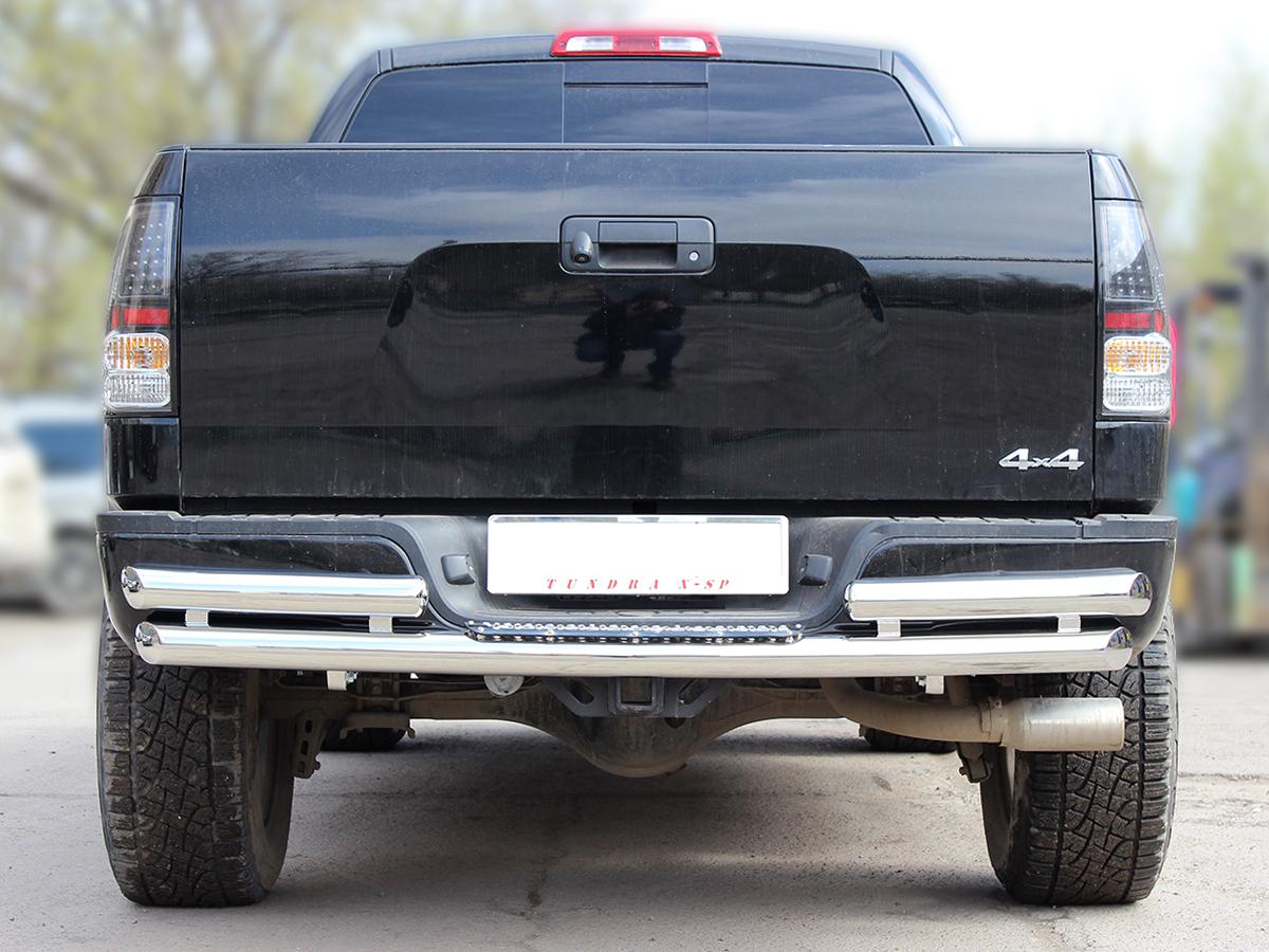 Защита заднего бампера d-76 двойная с нерж.степом, арт. TTU14_3 для автомобиля Toyota Tundra 2014-наст.вр. - представляет собой элемент тюнинга и защиты автомобиля и производится специально для данной модели компанией Технотек. Данное изделие изготавливается из высококачественной нержавеющей стали AISI 304 с полировкой, что обеспечивает сохранение отличного внешнего вида в течение длительного времени в наших непростых климатических условиях. Срок поставки составляет 1-5 дней. Установить деталь Защита заднего бампера d-76 двойная с нерж.степом для автомобиля Toyota Tundra 2014-наст.вр. можно на нашем сервисе, предварительно записавшись по телефону.