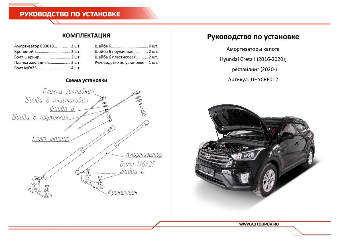 Амортизаторы капота АвтоУПОР (2 шт.) Hyundai Creta (2016-2020; 2020-), Rival, арт. UHYCRE012 (дополнительное изображение 1)