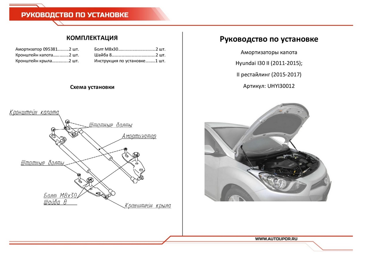 Амортизаторы капота АвтоУПОР (2 шт.) Hyundai I-30 (2011-2015; 2015-2017), Rival, арт. UHYI30012