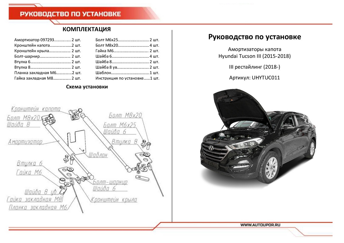 Амортизаторы капота АвтоУПОР (2 шт.) Hyundai Tucson (2015-2018;2018-2020), Rival, арт. UHYTUC011 (дополнительное изображение 1)