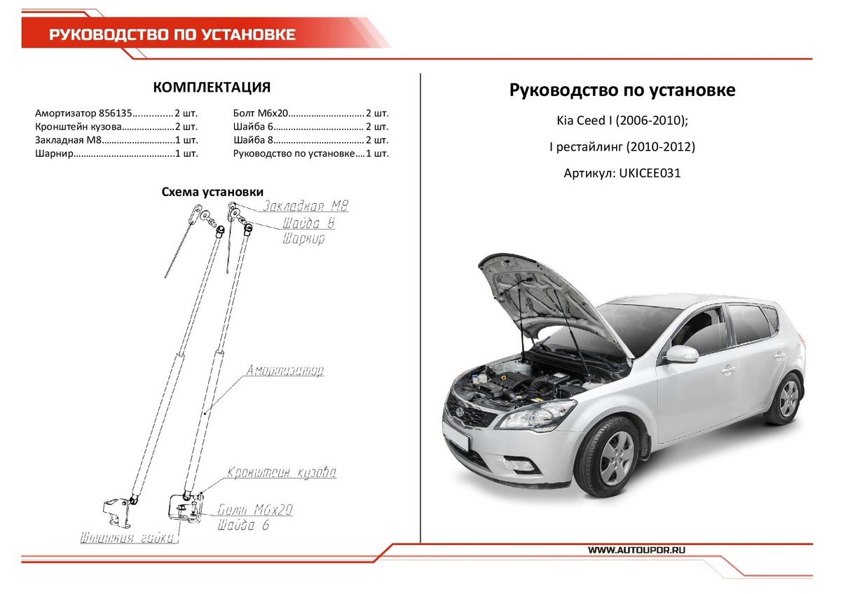 Амортизаторы капота АвтоУпор (2 шт.) KIA Ceed I/I рест. (2006-2010/2010-2012), Rival, арт. UKICEE031 (дополнительное изображение 1)
