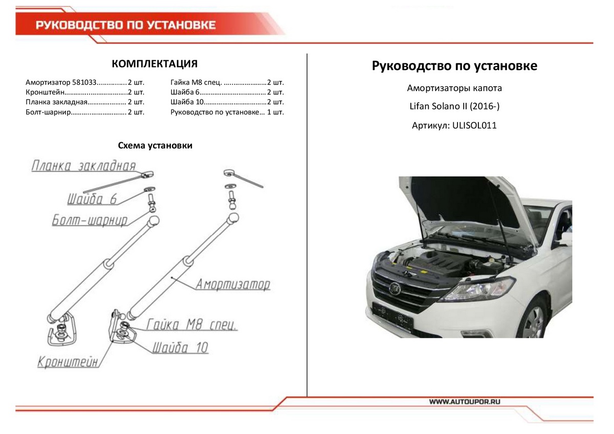 Амортизаторы капота АвтоУПОР (2 шт.) Lifan Solano II (2016-), Rival, арт. ULISOL011 (дополнительное изображение 1)