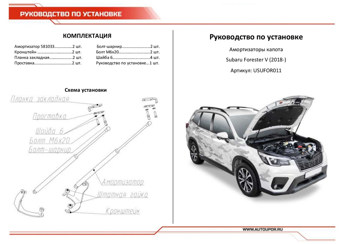 Амортизаторы капота АвтоУпор (2 шт.) Subaru Forester (2018-), Rival, арт. USUFOR011