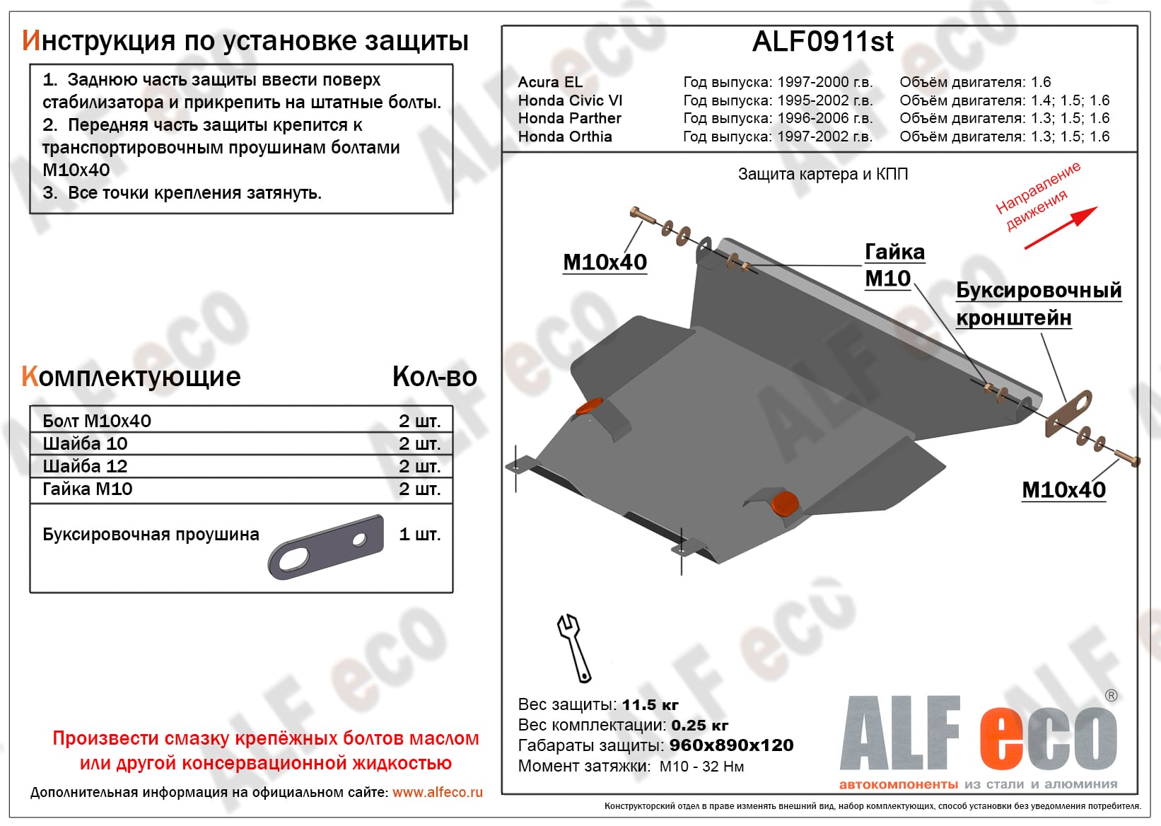 Защита картера и КПП ALFeco арт. ALF0911st изготовлена из стали толщиной 2мм специально для автомобиля Acura EL 1997-2000. Обеспечивает надежную защиту агрегатов от механических повреждений и попадания дорожной грязи и других предметов, встречающихся на проезжей части, способных зачастую нанести серьезный вред автомобилю. В комплекте идет весь необходимый крепеж для установки. Наличие можно уточнить по телефону. Возможна установка в нашем автосервисе по предварительной записи