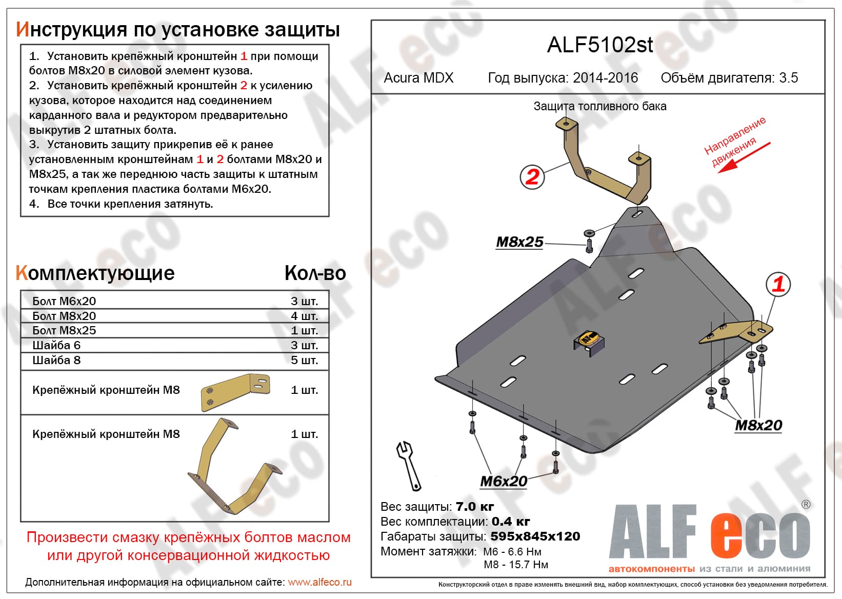 Защита топливного бака ALFeco арт. ALF5102st изготовлена из стали толщиной 2мм специально для автомобиля Acura MDX (YD3) 2014-2016. Обеспечивает надежную защиту агрегатов от механических повреждений и попадания дорожной грязи и других предметов, встречающихся на проезжей части, способных зачастую нанести серьезный вред автомобилю. В комплекте идет весь необходимый крепеж для установки. Наличие можно уточнить по телефону. Возможна установка в нашем автосервисе по предварительной записи