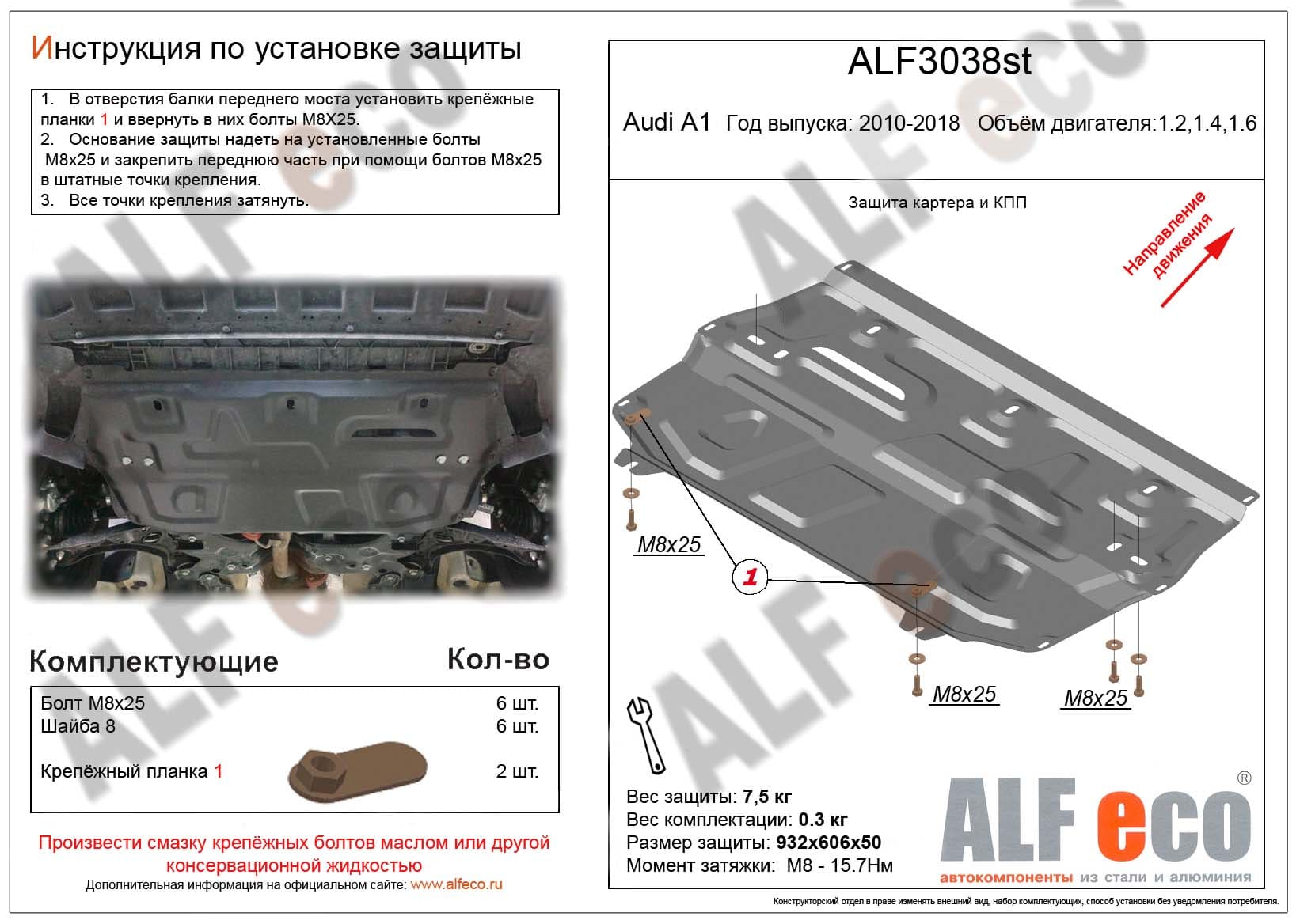 Защита картера и КПП Audi A1 2010-2018 V-1,2; 1,4; 1,6 , ALFeco, сталь 2мм, арт. ALF3038st