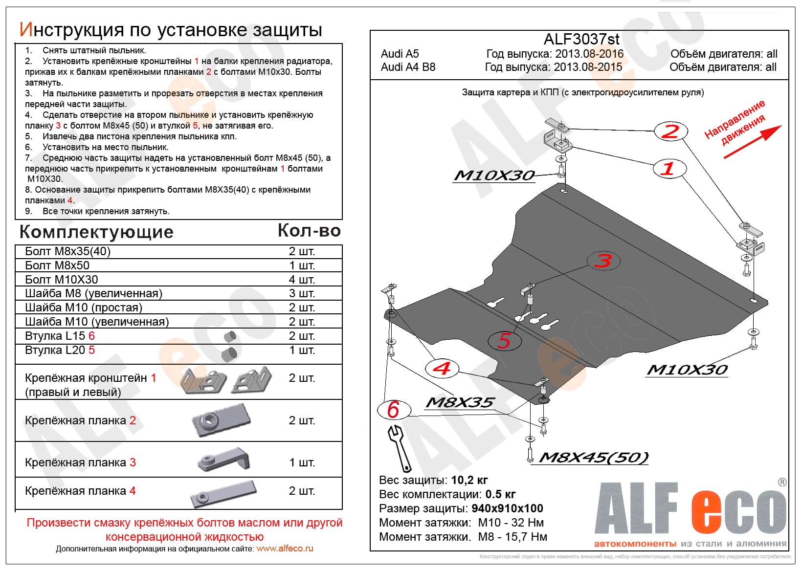 Защита картера и КПП (с электрогидроусилителем руля) ALFeco арт. ALF3037st-1 изготовлена из стали толщиной 2мм специально для автомобиля Audi A5 2013.08-2016. Обеспечивает надежную защиту агрегатов от механических повреждений и попадания дорожной грязи и других предметов, встречающихся на проезжей части, способных зачастую нанести серьезный вред автомобилю. В комплекте идет весь необходимый крепеж для установки. Наличие можно уточнить по телефону. Возможна установка в нашем автосервисе по предварительной записи