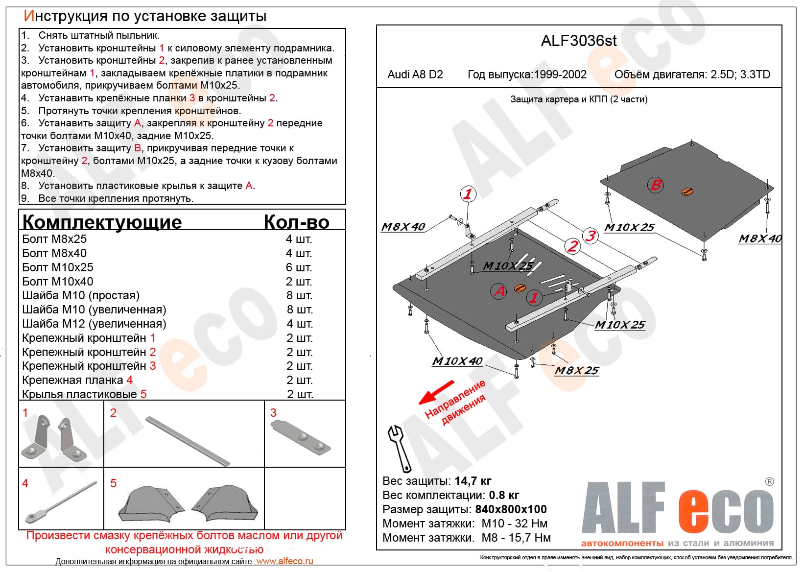 Защита картера и КПП (2 части) ALFeco арт. ALF3036st изготовлена из стали толщиной 2мм специально для автомобиля Audi A8 D2 1999-2002. Обеспечивает надежную защиту агрегатов от механических повреждений и попадания дорожной грязи и других предметов, встречающихся на проезжей части, способных зачастую нанести серьезный вред автомобилю. В комплекте идет весь необходимый крепеж для установки. Наличие можно уточнить по телефону. Возможна установка в нашем автосервисе по предварительной записи
