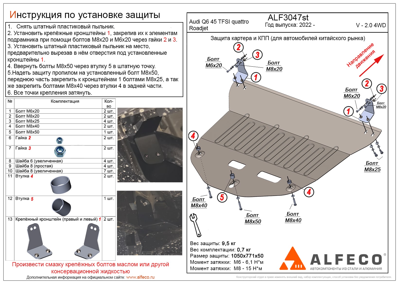 Защита картера и КПП ( рынок Китая) ALFeco арт. ALF3047al изготовлена из алюминия толщиной 4мм специально для автомобиля Audi Q6 2022-. Обеспечивает надежную защиту агрегатов от механических повреждений и попадания дорожной грязи и других предметов, встречающихся на проезжей части, способных зачастую нанести серьезный вред автомобилю. В комплекте идет весь необходимый крепеж для установки. Наличие можно уточнить по телефону. Возможна установка в нашем автосервисе по предварительной записи