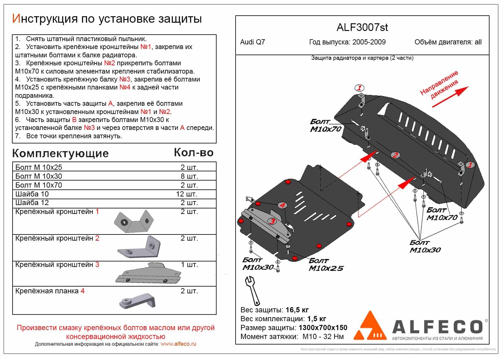 Защита радиатора и картера (2 части) ALFeco арт. ALF3007st изготовлена из стали толщиной 2мм специально для автомобиля Audi Q7 2005-2009. Обеспечивает надежную защиту агрегатов от механических повреждений и попадания дорожной грязи и других предметов, встречающихся на проезжей части, способных зачастую нанести серьезный вред автомобилю. В комплекте идет весь необходимый крепеж для установки. Наличие можно уточнить по телефону. Возможна установка в нашем автосервисе по предварительной записи