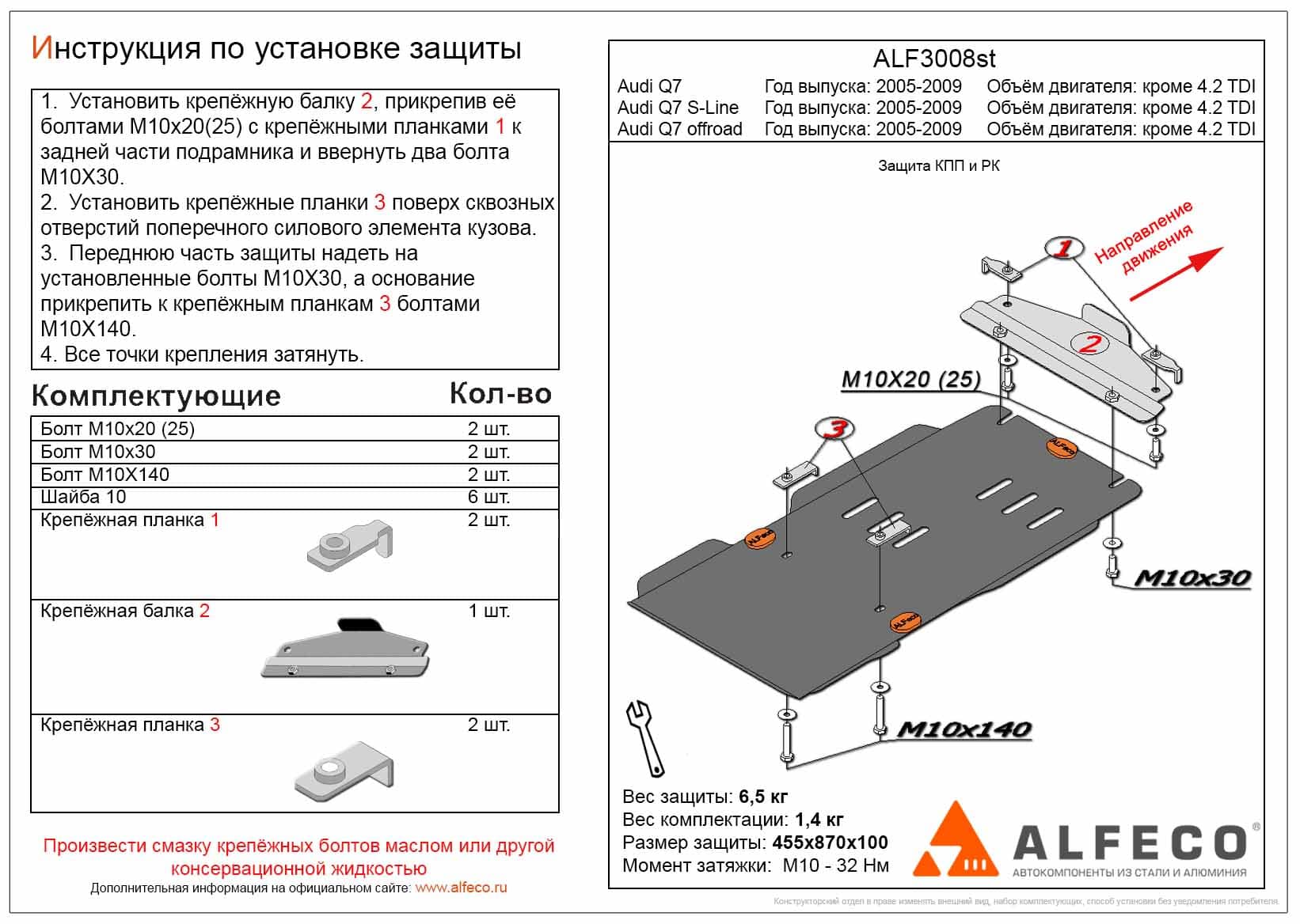 Защита КПП и РК ALFeco арт. ALF3008al-1 изготовлена из алюминия толщиной 4мм специально для автомобиля Audi Q7 offroad 2005-2009. Обеспечивает надежную защиту агрегатов от механических повреждений и попадания дорожной грязи и других предметов, встречающихся на проезжей части, способных зачастую нанести серьезный вред автомобилю. В комплекте идет весь необходимый крепеж для установки. Наличие можно уточнить по телефону. Возможна установка в нашем автосервисе по предварительной записи