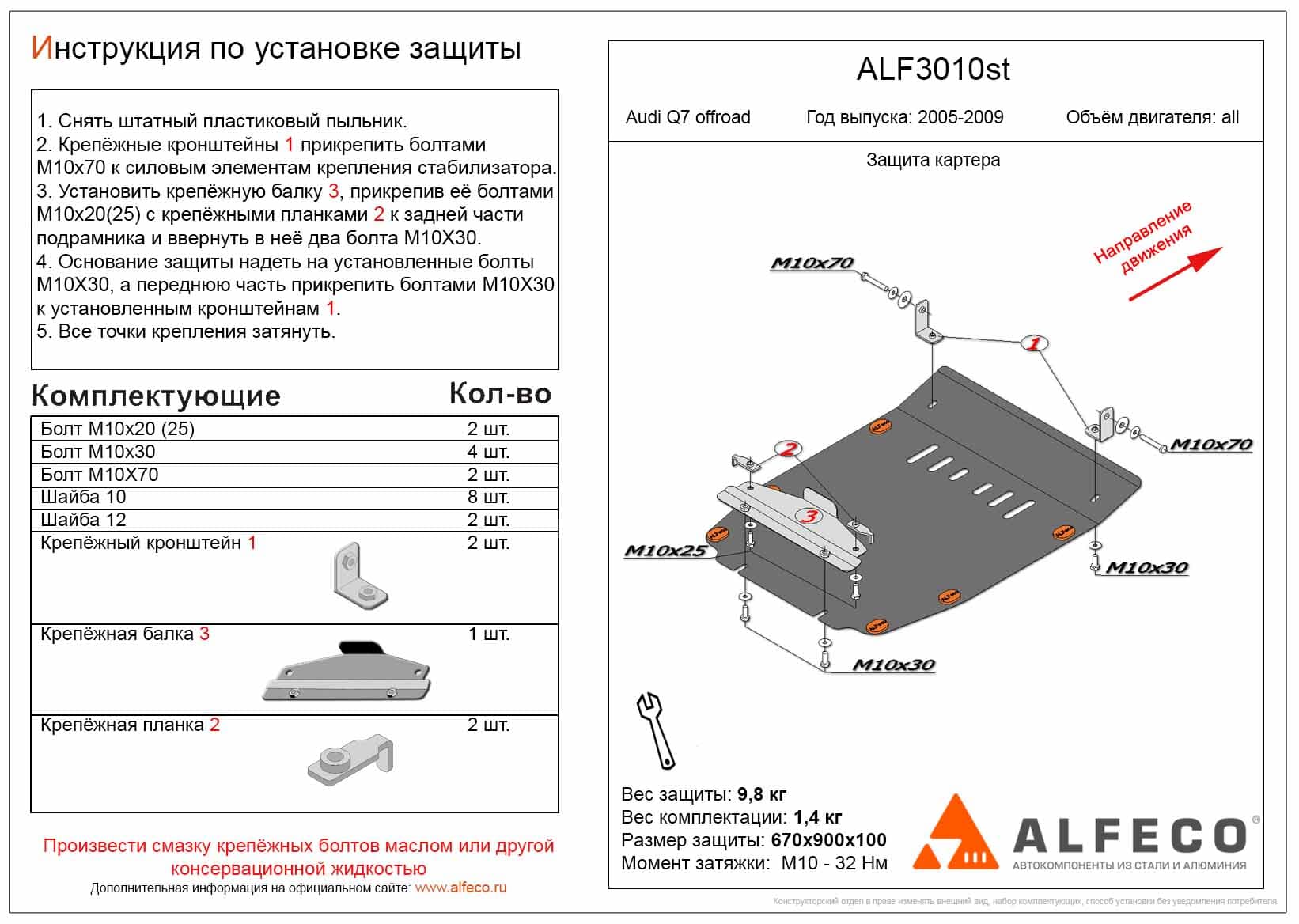 Защита картера ALFeco арт. ALF3010st изготовлена из стали толщиной 2мм специально для автомобиля Audi Q7 offroad 2005-2009. Обеспечивает надежную защиту агрегатов от механических повреждений и попадания дорожной грязи и других предметов, встречающихся на проезжей части, способных зачастую нанести серьезный вред автомобилю. В комплекте идет весь необходимый крепеж для установки. Наличие можно уточнить по телефону. Возможна установка в нашем автосервисе по предварительной записи