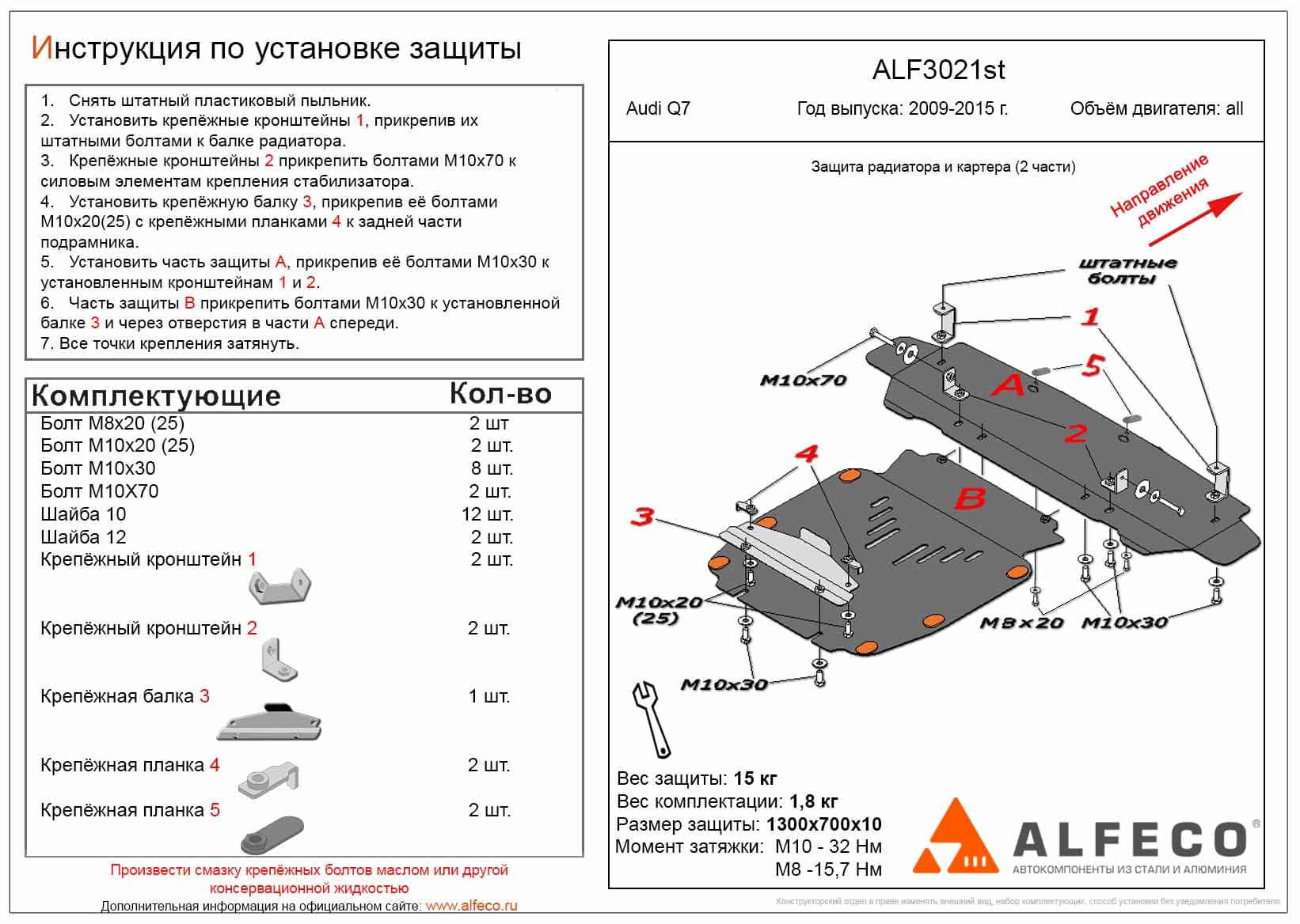 Защита радиатора и картера (2 части) ALFeco арт. ALF3021st изготовлена из стали толщиной 2мм специально для автомобиля Audi Q7 2009-2015. Обеспечивает надежную защиту агрегатов от механических повреждений и попадания дорожной грязи и других предметов, встречающихся на проезжей части, способных зачастую нанести серьезный вред автомобилю.