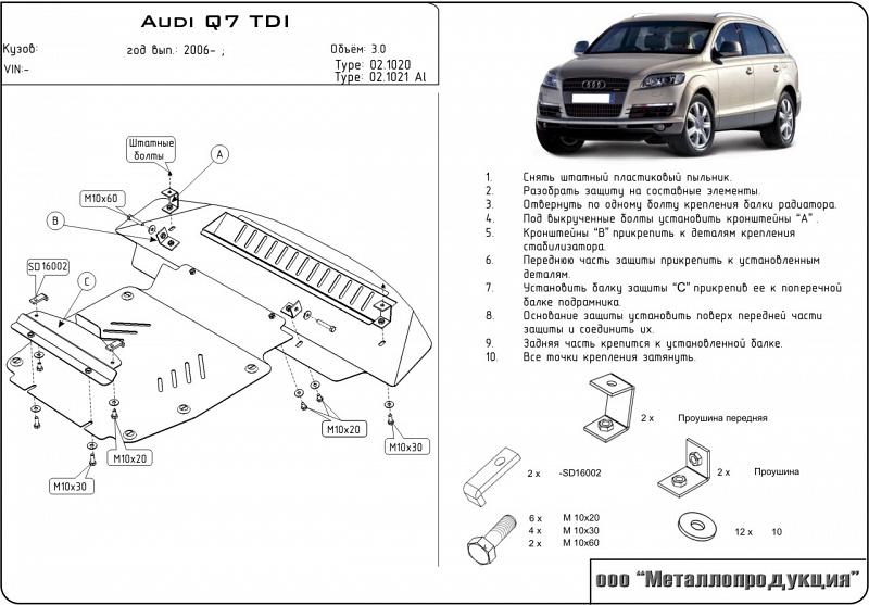 Приобретая стальную защиту 02.1020 для AUDI Q 7 2006 - 2015, вы можете установить ее в нашем сервисе. Стоимость установки от 1100 рублей за лист, предварительно необходимо записаться по телефону на удобное для вас время.